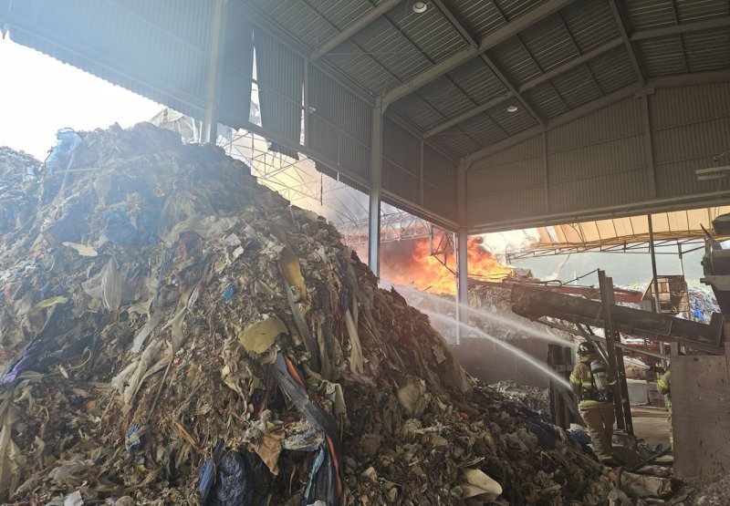 (상주=뉴스1) 신성훈 기자 = 지난 18일 오전 6시37분쯤 경북 상주시 낙동면 상촌리의 자원재활용시설에서 발생한 불이 15시간 만에 진화됐다.