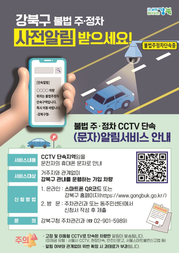 이 서비스는 차량 운전자가 강북구 내 CCTV 단속 지역에 진입할 경우 해당 위치가 단속 구역임을 휴대전화 문자로 안내하는 방식이다.