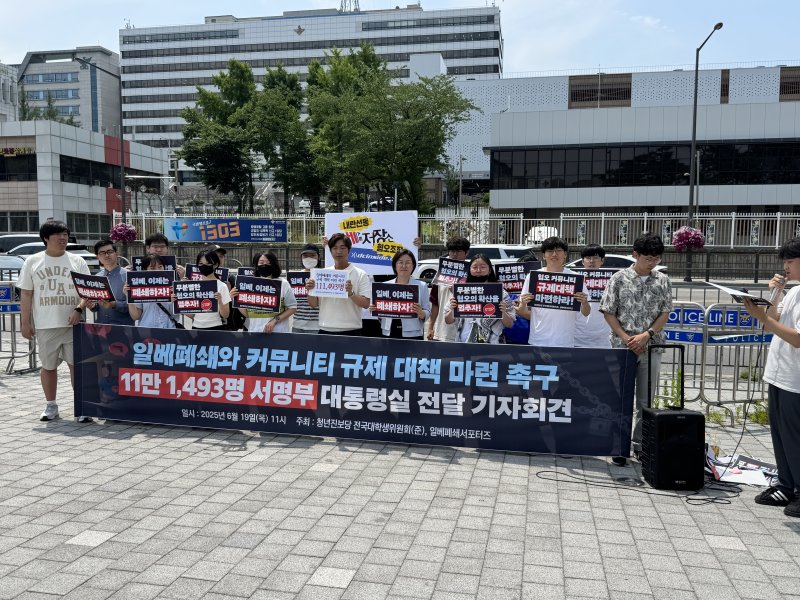 정혜경 진보당 의원과 청년진보당 전국대학생위원회, 일베폐쇄 서포터즈 일동 약 15명은 19일 오전 11시쯤 서울시 용산 대통령실 앞에서 기자회견을 열고 대통령실에 시민 서명을 제출했다.