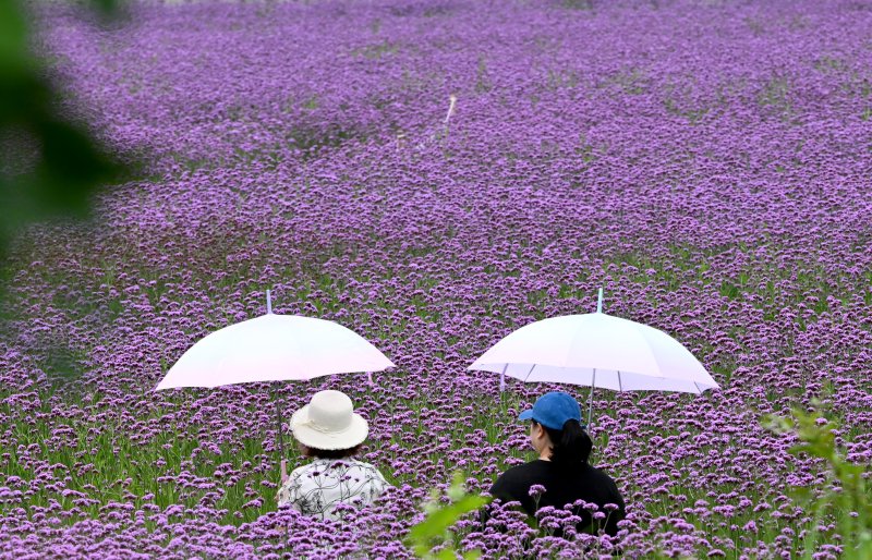 [광주=뉴시스] 김혜인 기자 = 19일 오후 광주 광산구 서봉동 황룡강생태정원에 만개한 버들마편초 사이로 시민들이 나들이를 즐기고 있다. 2025.06.19. hyein0342@newsis.com