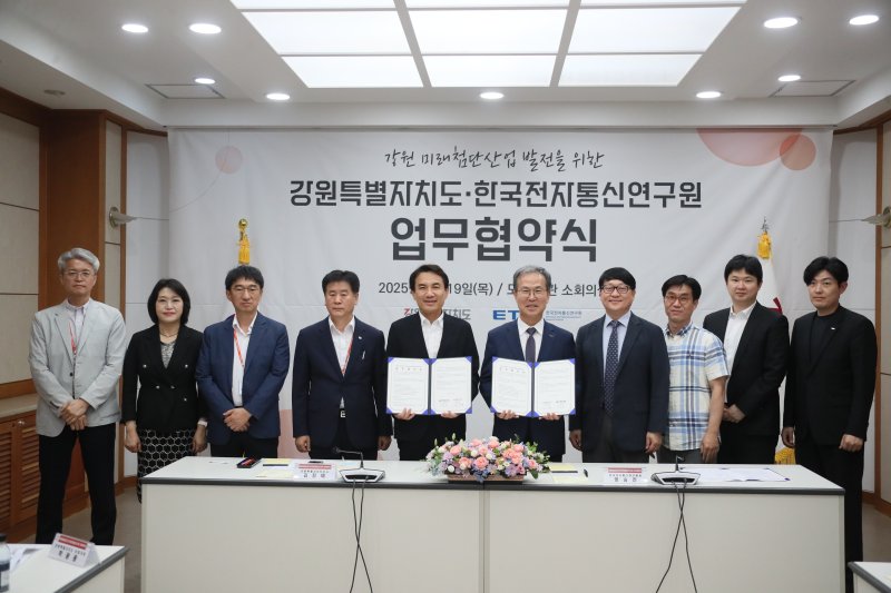 (춘천=뉴스1) 이종재 기자 = 강원특별자치도는 19일 도청 본관 회의실에서 한국전자통신연구원과 강원형 미래산업 생태계 조성을 위한 업무협약을 체결했다.