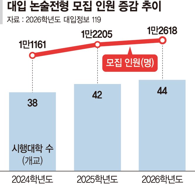 2026학년도 논술전형 모집 인원은 1만2618명으로 2025학년도 1만2205명보다 413명 늘었다. 논술전형을 시행하는 대학 수도 2025학년도 42개교에서 2026학년도 44개교로 2개교 늘었다.