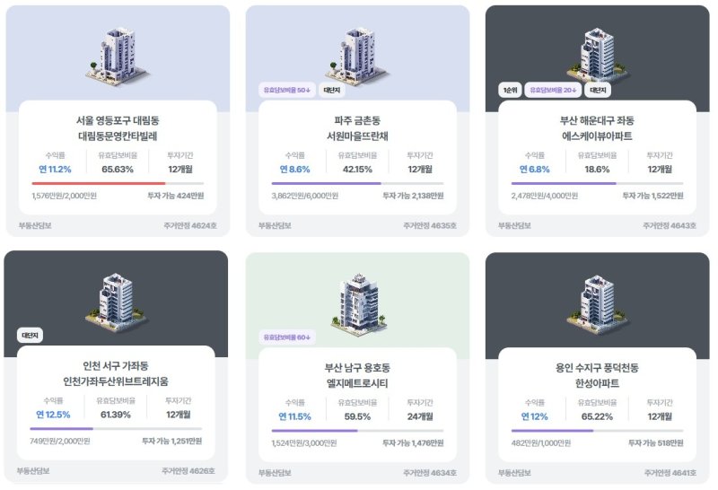이날 공개한 26개 상품의 평균 연 수익률은 11.2%다. 평균 상환 기간은 12개월, 평균 모집금액은 6200만원이다. 투자자는 5000원부터 최대 500만원까지 다양한 입지의 아파트에 분산 투자할 수 있다. 상품별 수익률은 7~13% 수준이다.