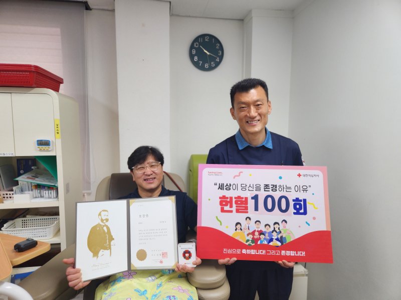 20일 광주전남혈액원에 따르면 혈액원 제제팀 소속 김대원 과장과 문인국 과장이 각각 100회 헌혈을 달성했다.
