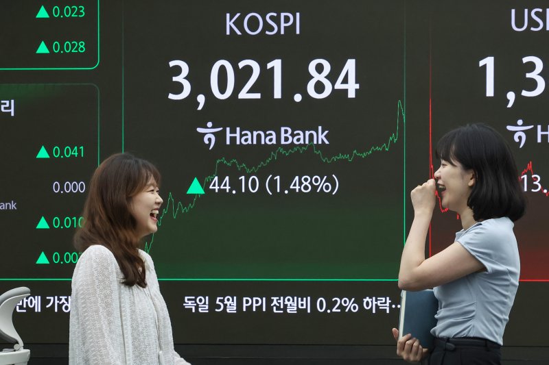 (서울=뉴스1) 문혜원 기자 = 코스피가 심리적 저항선인 3000선을 뚫고 3020선까지 치솟았다. 6월 초 이재명 정부가 들어선 이후 단 하루를 제외하고 연속 랠리를 펼치며 3년 6개월여만에 최고치를 기록했다.