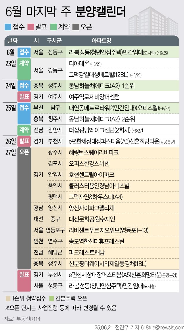 [서울=뉴시스]정진형 기자 = 부동산R114는 6월 마지막 주 전국 3개 단지 총 930가구가 분양을 시작한다고 21일 밝혔다. 이중 일반분양 물량은 650가구다.