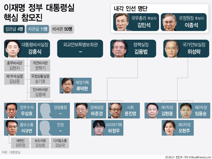 [서울=뉴시스] 김지은 김경록 기자 = 이재명 대통령이 취임 후 단행한 대통령실과 내각 등 이재명 정부 초기 주요 인선을 보면 측근과 실무형 전문가를 전진 배치했다는 평가가 나온다. 대통령직인수위원회라는 준비 기간 없이 곧바로 국정 운영에 착수한 만큼 가까운 거리에서 실력과 신뢰성을 검증한 인물들을 등용해 강한 리더십으로 국정을 안정적으로 이끌어가겠다는 의도로 해석된다.
