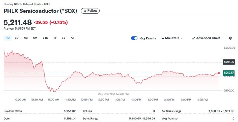 20일(현지시간) 뉴욕증시에서 반도체지수는 0.75% 하락한 5211.48포인트를 기록했다.