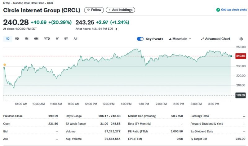 20일(현지시간) 뉴욕증시에서 서클은 20.39% 폭등한 240.28달러를 기록했다. 이로써 서클은 지난 5일 상장 이후 무려 675% 폭등했다.