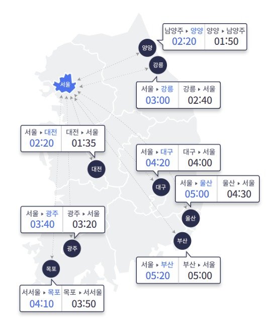 같은 시각 지방 도시에서 서울까지는 △부산 5시간 △울산 4시간 30분 △강릉 2시간 40분 △양양 1시간 50분(남양주 도착) △대전 1시간 35분 △광주 3시간 20분 △목포 3시간 50분(서서울 도착) △대구 4시간이다.