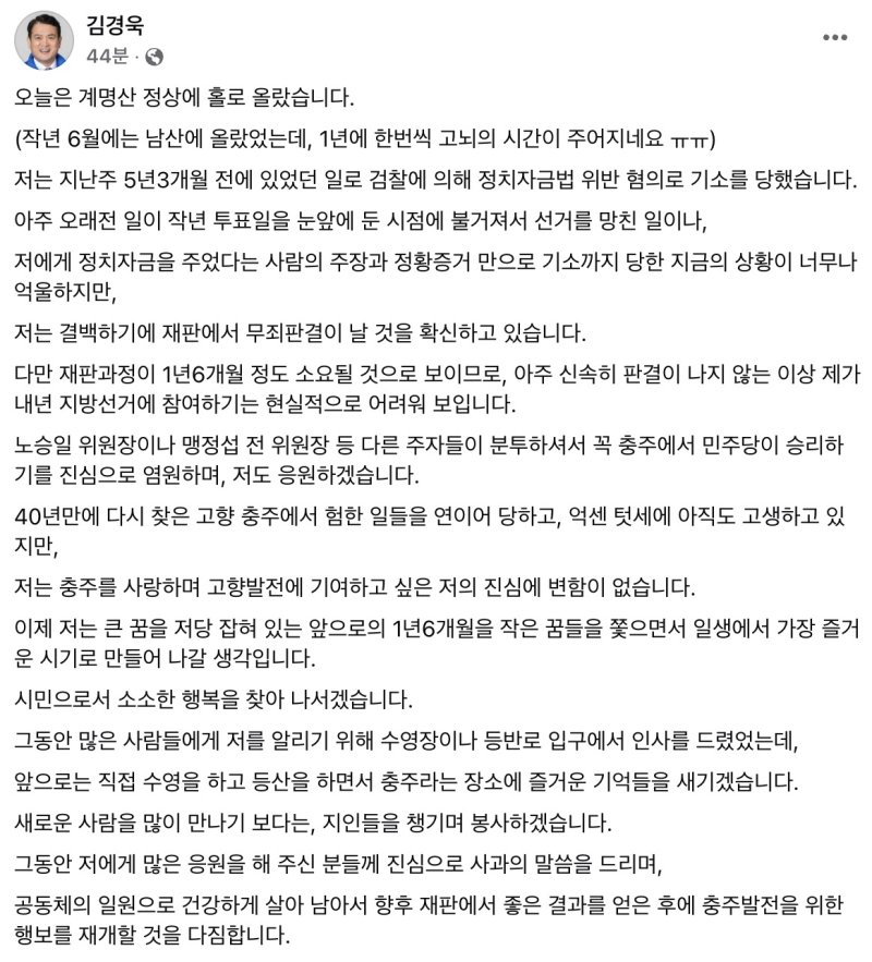 김 전 사장은 "충주를 사랑하며 고향 발전에 기여하고 싶은 저의 진심에 변함이 없다"면서 "시민으로서 소소한 행복을 찾아 나서겠다"라고 말했다.