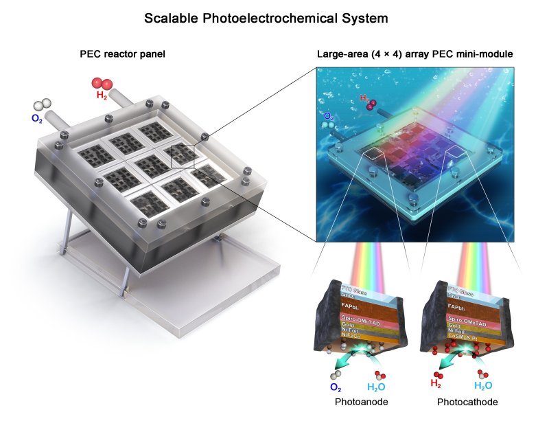 연구팀은 페로브스카이트 기반의 태양광 흡수층과 니켈-철-코발트 촉매를 활용해 1㎠ 단위의 고효율 광전극을 제작하고 이를 4×4 배열로 확장한 모듈형 인공나뭇잎을 개발했다.