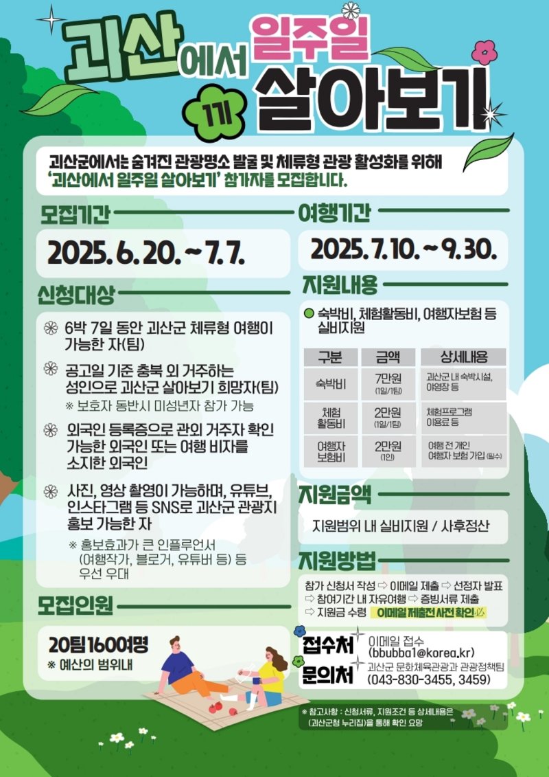 '충북 일단 살아보기' 사업의 하나로 추진하는 이 사업은 괴산의 체류형 관광을 육성해 생활 인구를 늘리고, 지역 숨겨진 관광명소를 발굴해 홍보하려고 마련했다.