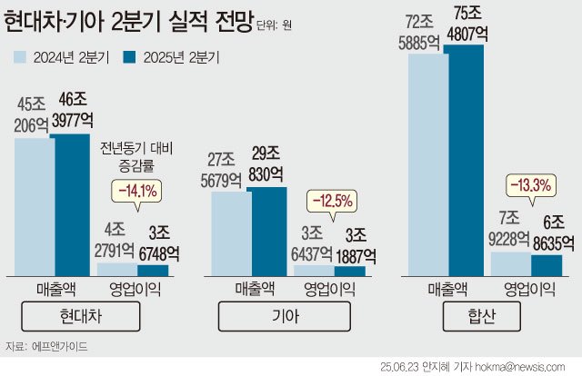 23일 금융정보업체 에프앤가이드에 따르면 현대차와 기아의 2025년 2분기 연결 기준 합산 매출은 75조4807억원으로 전년 동기(72조5885억원) 대비 4.0% 증가할 것으로 집계됐다.