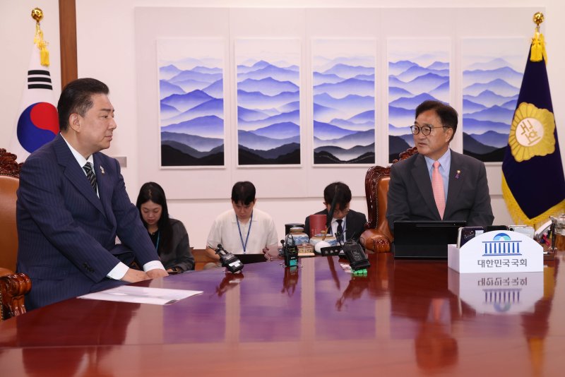 국회에 따르면 우 의장과 김병기 민주당 원내대표, 송언석 국민의힘 원내대표는 이날 오전 11시 서울 여의도 국회에서 첫 상견례에 나선다.