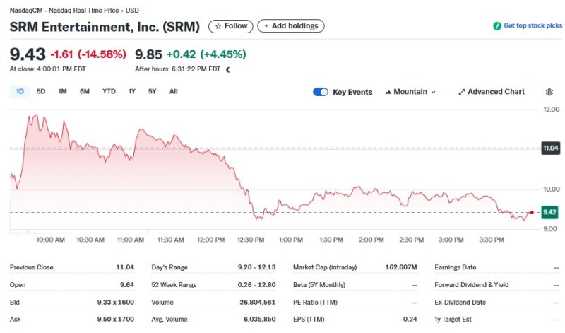 23일(현지시간) 뉴욕증시에서 SRM은 14.58% 폭락한 9.43달러를 기록했다.