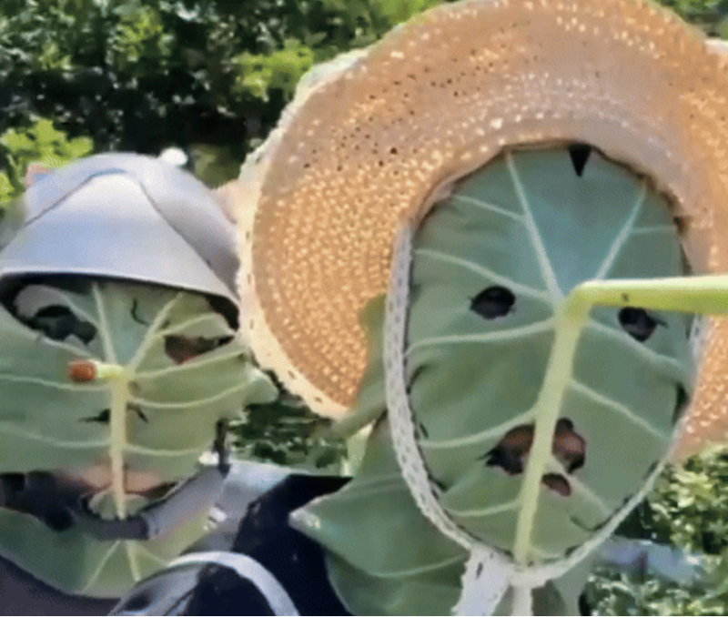 [파이낸셜뉴스] 중국의 한 청년이 햇빛은 피하면서 더위는 막기 위해 연잎으로 마스크를 만들어 착용한 영상이 소셜네트워크서비스(SNS)에 올라온 뒤 화제가 되고 있다.