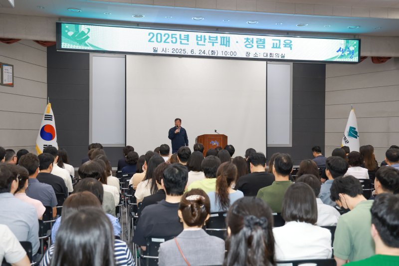 [산청=뉴시스] 서희원 기자 = 경남 산청군은 24일 군청 대회의실에서 이승화 산청군수를 비롯해 5급 이상 간부 공무원 및 승진자, 신규 임용자 등 300여명이 참석한 가운데 올해 '반부패·청렴 교육'을 실시했다.