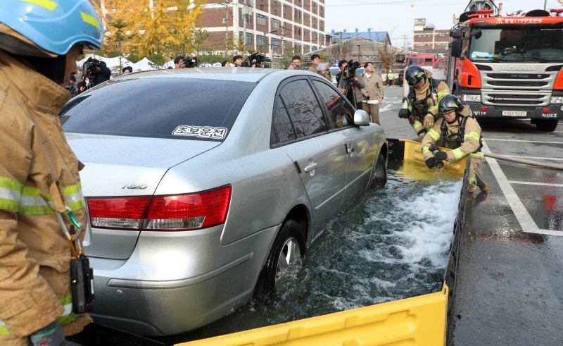 훈련은 건물 1층에 주차한 택배용 전기차에서 화재가 발생해 불이 상층부까지 확산하는 상황을 가정해 진행됐다.
