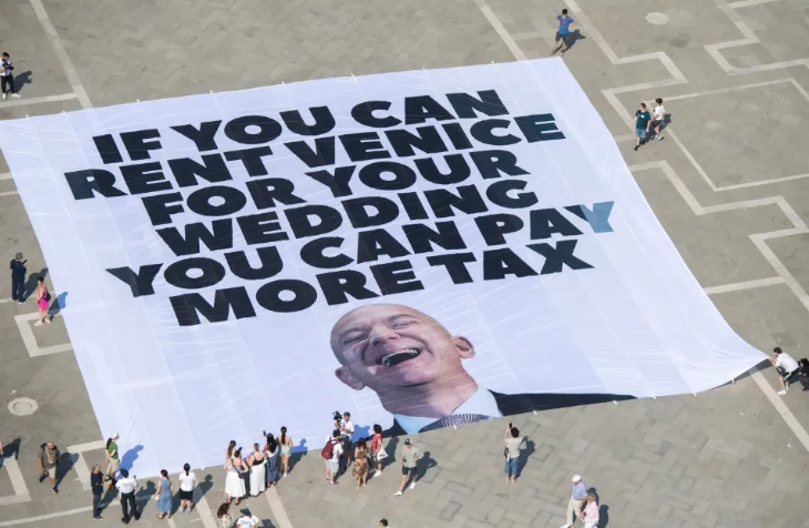 지난 23일(현지시간) 이탈리아 베네치아의 산마르코 광장에 아마존 창업자 제프 베이조스의 얼굴이 들어간 대형 현수막에는 이 같은 글귀가 적혀 있었다.