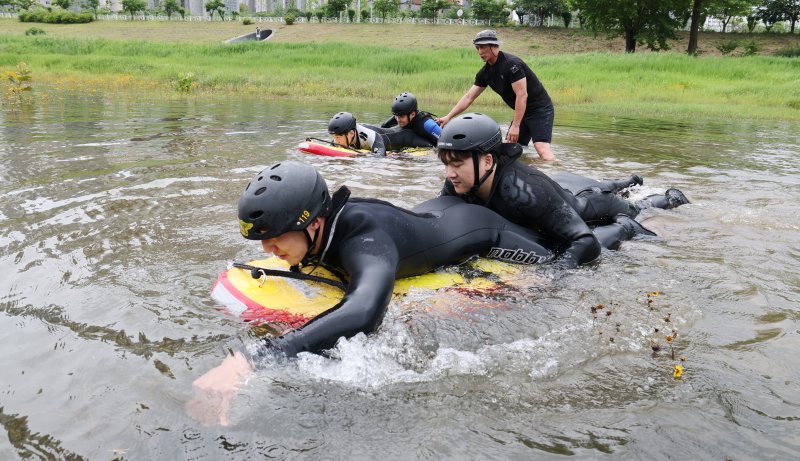 훈련에는 구조대원과 119안전센터 생활안전대원 60여 명이 참여해 △급류 상황 시 드로우백(Throw Bag)을 활용한 인명 구조법 △소방호스 및 로프를 이용한 수상구조기법 △맨몸 진입 및 서프보드 활용 구조법 △복수의 익수자 발생 상황을 가정한 시나리오 기반 구조훈련 등이다.