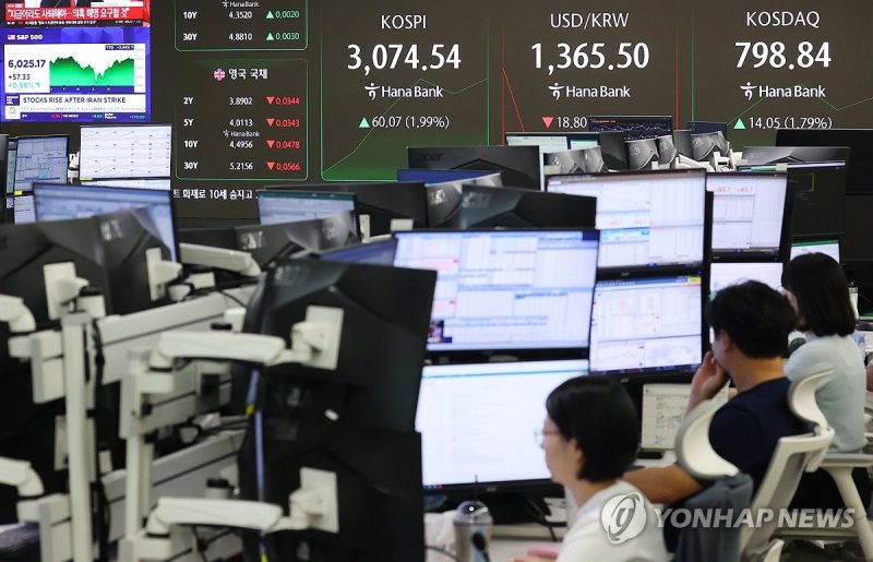 (서울=연합뉴스) 곽윤아 기자 = 코스피가 24일 이스라엘과 이란의 휴전 소식에 3% 가까이 급등해 3년 9개월 만에 3,100선을 돌파했다.