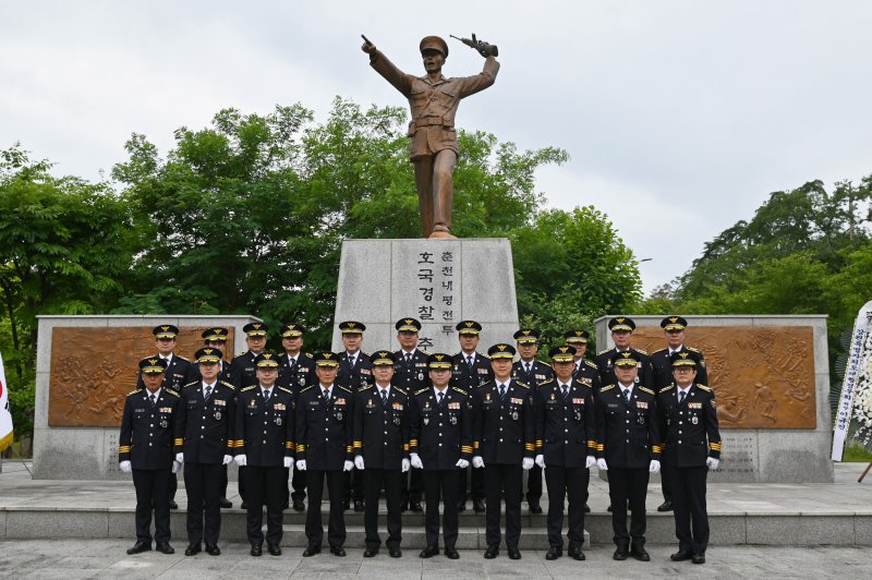 (춘천=뉴스1) 이종재 기자 = 강원경찰청은 6·25전쟁 75주년을 맞아 나라를 위해 희생한 호국영웅들의 넋을 기리고자 24일 춘천시 신북읍 내평전투 호국영웅 추모상을 찾아 ‘제10회 내평전투 호국영웅 추념식’을 개최했다.