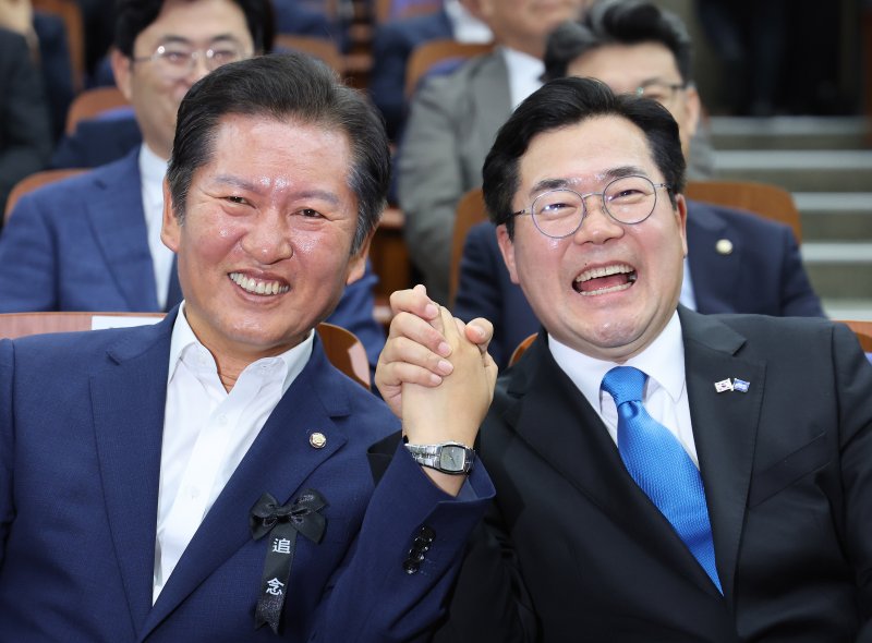 [서울=뉴시스] 김명년 기자 = 더불어민주당 당대표 출마 선언을 한 정청래(왼쪽), 박찬대 의원이 24일 오후 서울 여의도 국회에서 열린 의원총회에서 손을 잡고 미소짓고 있다. 2025.06.24. kmn@newsis.com [서울=뉴시스] 류현주 기자 = 더불어민주당 당 대표 선거 출마를 선언한 정청래 의원과 박찬대 전 원내대표가 24일 국회에서 열린 민주당 의원총회에 나란히 참석했다.