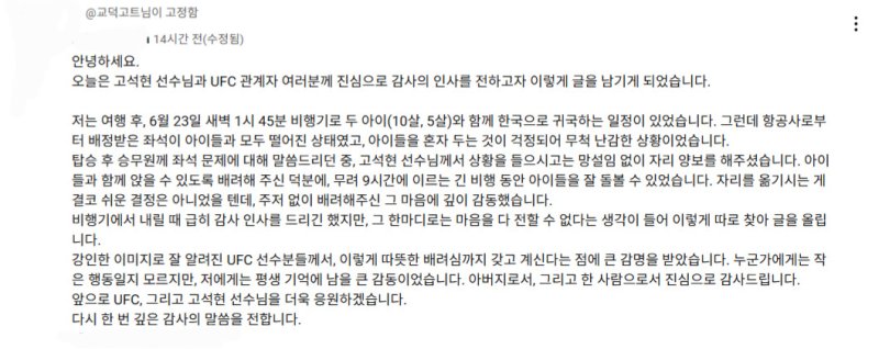 이후 "아버지로서, 그리고 한 사람으로서 진심으로 감사드린다. 앞으로 UFC, 그리고 고석현 선수님을 더욱 응원하겠다"라며 글을 마쳤다.
