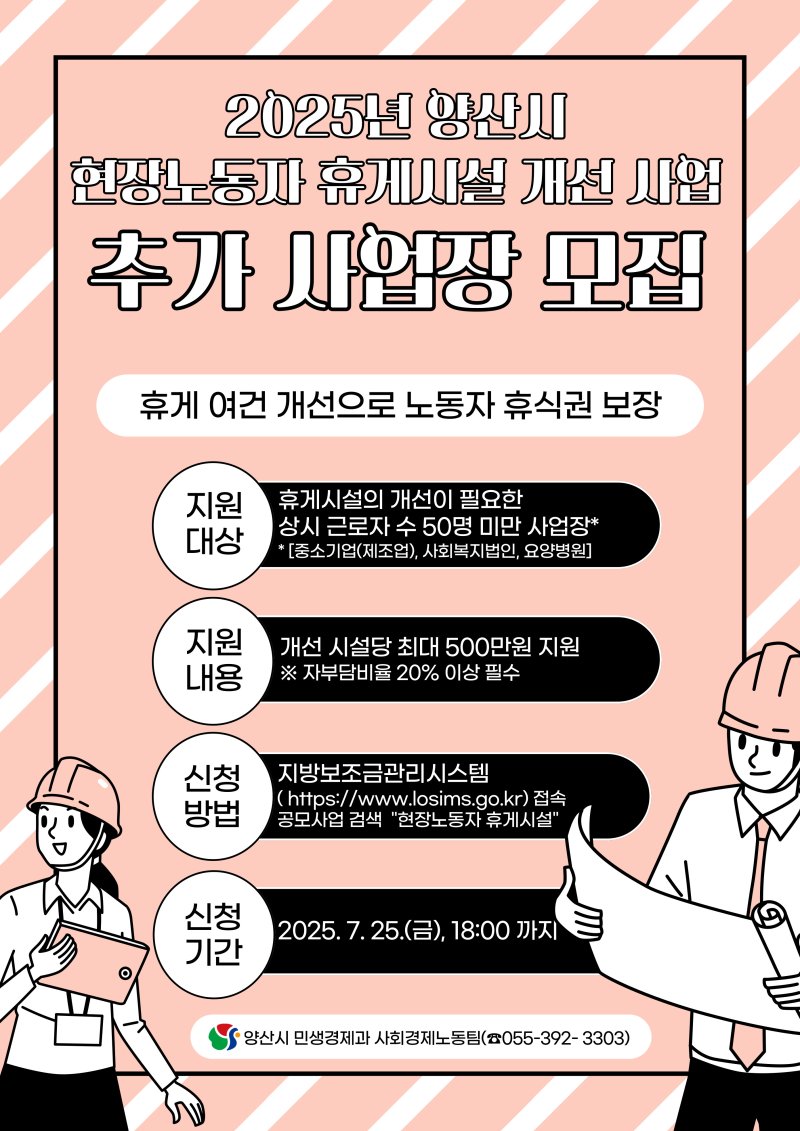 이번 사업은 제조업 사업장, 사회복지시설(비영리법인), 요양병원 등 양산시 관내 상시근로자 50인 미만 사업장이 대상이이다. 휴게시설 구조 개선을 위한 공사비와 냉난방기, 조명, 식수 설비 등 설치에 필요한 물품 구입비를 포함해 최대 500만원의 보조금이 지원된다.