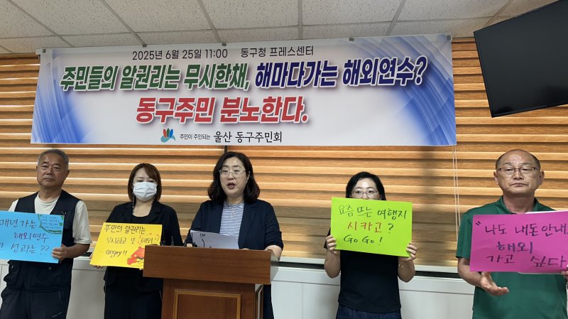 (울산=뉴스1) 김지혜 기자 = 울산동구주민회가 25일 울산동구청 프레스센터에서 기자회견을 열어 "주민의 알 권리를 무시한 채 해마다 떠나는 동구의회 의원들의 해외연수에 주민들은 분노한다"고 밝혔다.