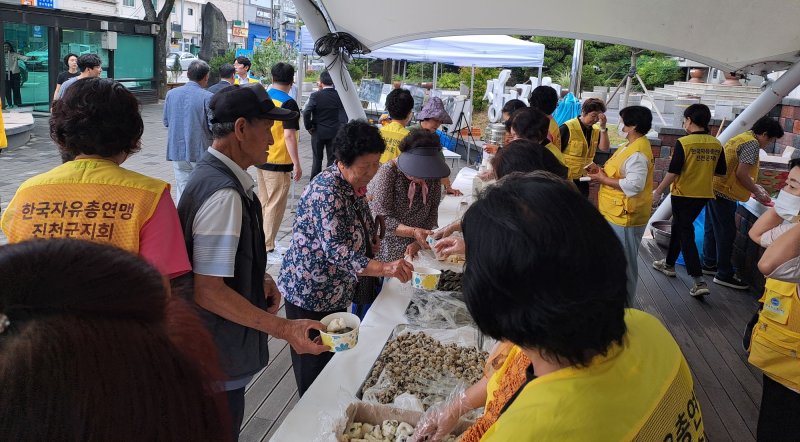 한국자유총연맹 회원 20여 명이 6·25전쟁 당시 먹었던 찐감자, 쑥개떡, 주먹밥 200인분을 군민에게 나눠 줬다.