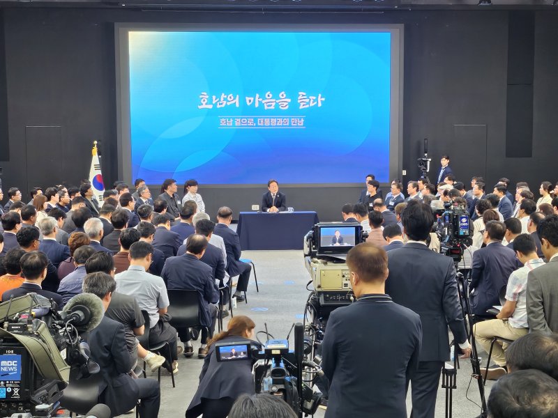 이재명 대통령이 취임 후 처음으로 광주를 찾은 25일 오후. 타운홀 미팅이 예정된 광주 동구 국립아시아문화전당(ACC) 국제회의실은 이 대통령의 모습을 보기 위한 광주·전남 지역민들로 북적였다.