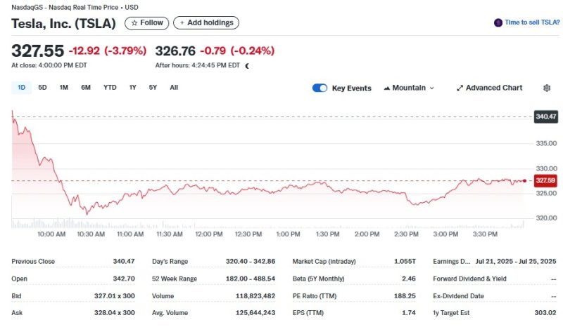 일단 테슬라는 3.79% 급락한 327.55달러로 장을 마감했다. 이에 따라 시총도 1조550억달러로 줄어, 시총 1조달러를 가까스로 유지했다.