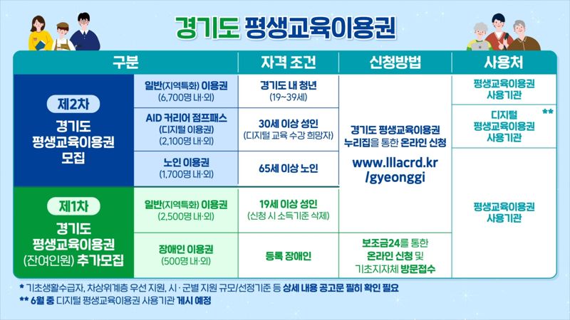 일반·청년·디지털·노인이용권은 경기도 평생교육이용권 누리집에서, 장애인이용권은 보조금24 누리집에서 신청할 수 있다.