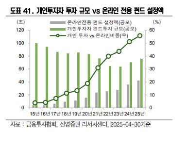 또한 2025년 상반기 펀드시장의 특징 중 하나는 개인의 온라인을 통한 펀드투자의 지속 확대를 꼽을 수 있다. 2022년과 2023년에도 유입 강도는 완화되었지만 연간 약 2조 원 내외 증가해 2023년에는 온라인 전용 펀드의 설정액 규모가 28조 대에 육박할 정도로 성장했다.