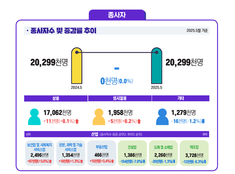 사업체 종사자 수는 인구 구조 변화 등의 영향으로 2022년 이후 증가세가 둔화됐고, 올해 1월에는 5만5000명이 줄며 감소세로 전환됐다. 이후 감소 폭이 줄어들다가 5월에는 전년 수준으로 다시 회복됐다.
