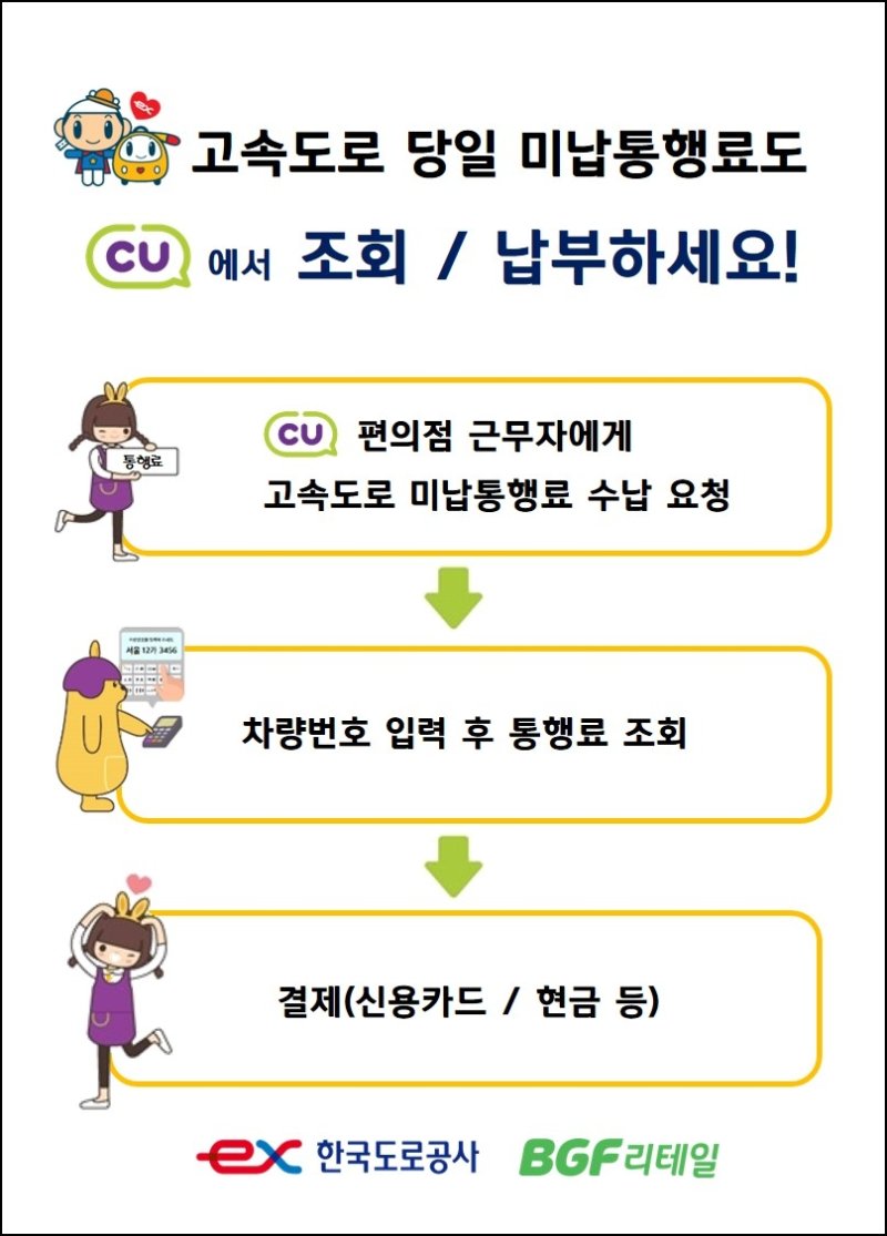 그동안 CU·GS25 편의점에서 고속도로 미납 통행료를 발생일 다음 날부터 납부할 수 있었다. 이번 시스템 개선에 따라 전국의 CU 편의점 1만8677곳에서는 미납 통행료를 당일에 납부할 수 있다.