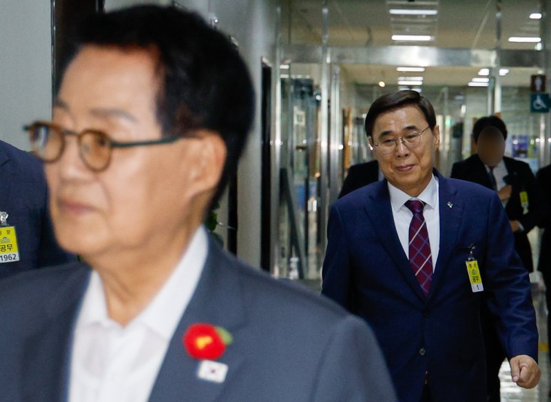 이종석 국가정보원장 후보자가 19일 오후 서울 여의도 국회 정보위원회 회의실에서 대북·안보 관련 질의를 위해 비공개로 속개된 인사청문회에 출석하고 있다. 왼쪽은 전 국정원장인 박지원 더불어민주당 의원. 2025.6.19/뉴스1 ⓒ News1 안은나 기자