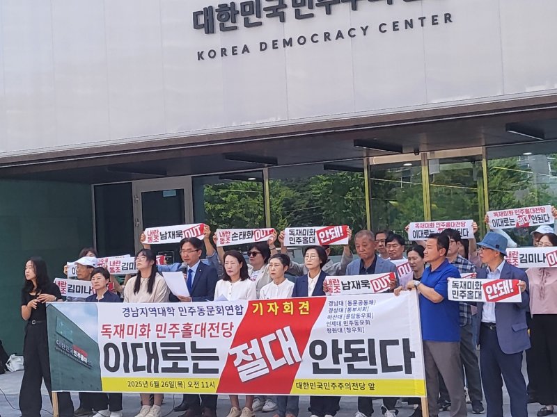 경남대, 경상대, 마산대, 인제대, 창원대 등 5개 대학 민주동문회 연합은 26일 창원시 마산합포구 대한민국 민주주의 전당 앞에서 기자회견을 열고 "민주주의 전당 재단장을 위한 민관 운영위원회를 구성하고 자문위원회를 새로 구성해야 한다"고 촉구했다.