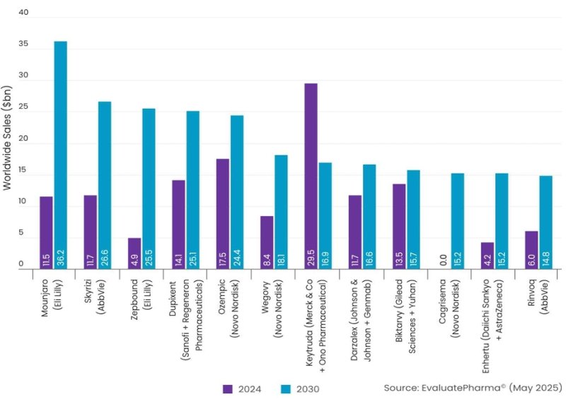 구체적으로 일라이 릴리의 마운자로와 젭바운드는 각각 2030년 가장 많이 팔린 약물과 세 번째로 많이 팔린 약물이 될 것이라는 예측이다.