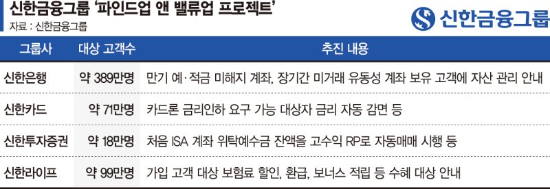 신한금융은 이달 말부터 3개월 동안 약 580만명의 고객을 대상으로 숨겨진 자산을 찾아 가치를 높여주는 '파인드업 & 밸류업(Find-up & Value-up) 프로젝트'를 시행한다고 26일 밝혔다.
