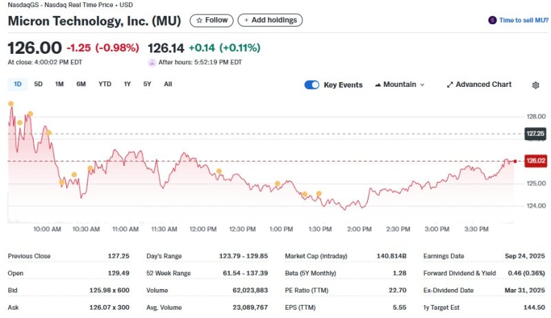 26일(현지시간) 뉴욕증시에서 마이크론은 0.98% 하락한 126달러를 기록했다.