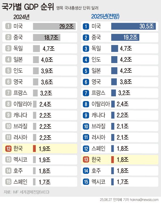 반면 우리와 경제 규모가 비슷한 스페인은 올해 2.5%, 호주는 1.6%의 성장률을 기록할 것으로 예상된다. 이들 국가는 코로나19 팬데믹 종료 이후 양호한 성장세를 이어가고 있어 우리나라의 GDP 순위는 앞으로 더 떨어질 가능성이 커졌다.