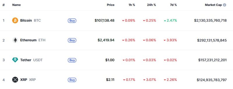 27일 오전 7시 30분 현재 글로벌 코인 시황 중계사이트인 코인마켓캡에서 비트코인은 0.25% 하락한 10만7138달러를 기록하고 있다.