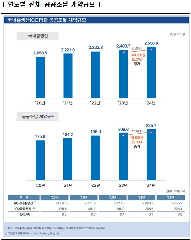 또한, 지난해 공공조달실적 225조1000억원은 우리나라 국내총생산(GDP)의 9%수준으로, 공공조달이 내수 및 민생경제를 뒷받침하는 중요한 축으로 작용하고 있음을 반영하고 있다.