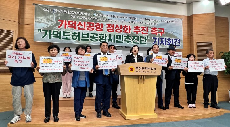 가덕도허브공항시민추진단 등 부산 시민단체는 이날 부산시의회 브리핑룸에서 기자회견을 열고 "국토교통부는 가덕도신공항 부지조성 공사 재입찰을 즉각 돌입하고 정상화시킬 구체적 로드맵을 발표하라"고 압박했다.