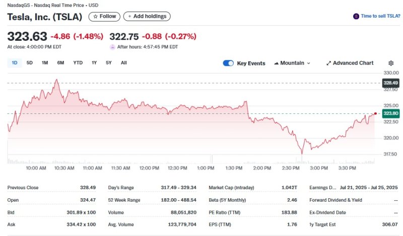 27일(현지시간) 뉴욕증시에서 테슬라는 1.48% 하락한 323.63달러를 기록했다. 이로써 시총도 1조420억달러로 줄어 시총 1조달러를 겨우 턱걸이했다.