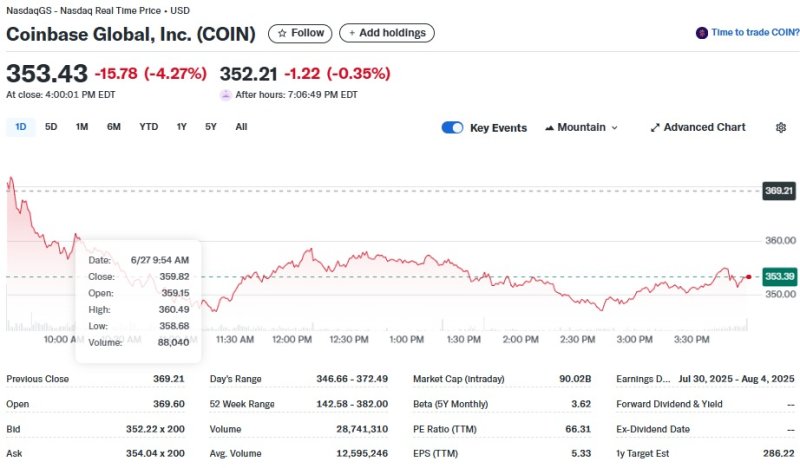 27일(현지 시간) 뉴욕증시에서 코인베이스는 4.27% 급락한 353.43달러를 기록했다.
