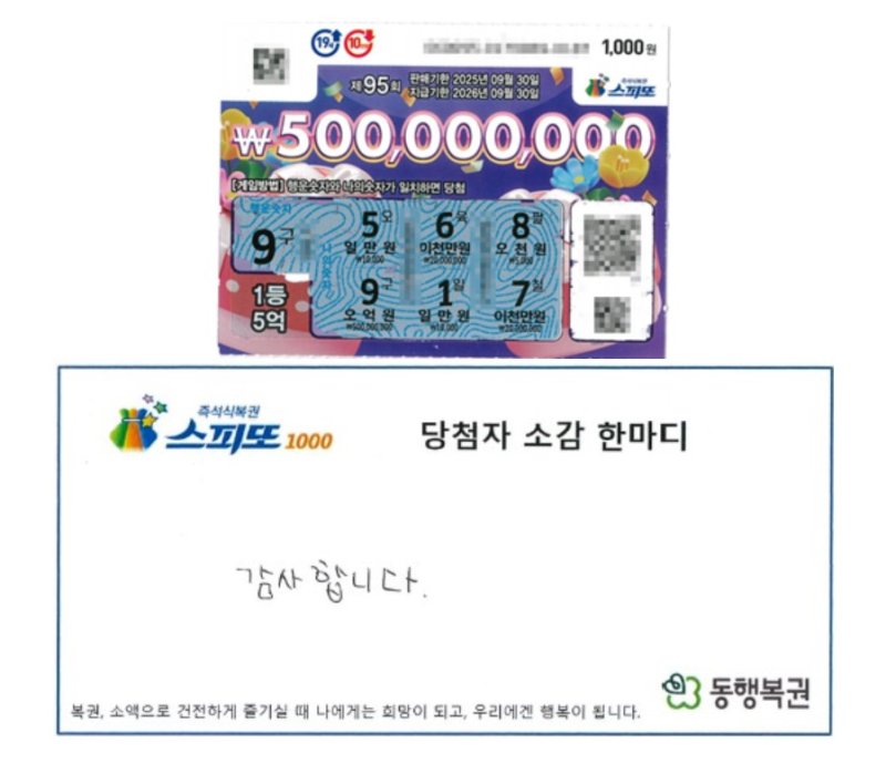 A씨는 "며칠 뒤 구매했던 복권이 생각나서 긁기 시작했는데 놀랍게도 5억 원에 당첨됐다. 1등에 당첨된다면 엄청 기쁠 거라 생각했는데, 오히려 현실감이 없어서 실감이 나지 않았다"라고 전했다.
